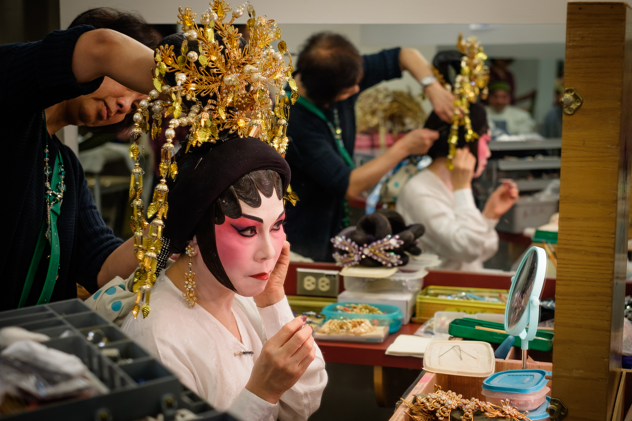 The performers need about two to three hours to do their hair and make up. So, I arrived about two and a half hours before the performance to capture the preparation process. Each performer undergoes a magical transformation that’s fascinating to watch. Once remade, their characters become alive, and their prior selves are no longer recognizable. For me, it’s just as enjoyable to capture the transformation as it is the performance. I chose a 35mm lens to shoot this process because I like the sharpness and nice bokeh the lens produces.
